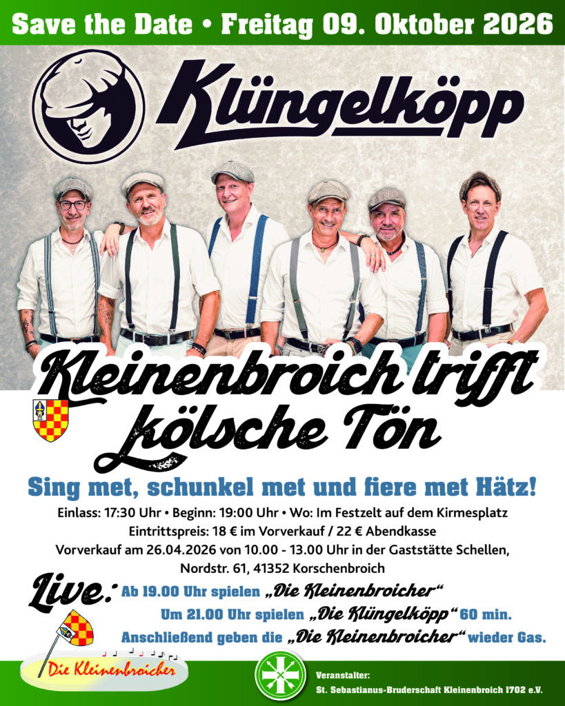 Kleinenbroich darf sich auf ein echtes Highlight freuen: Die Klüngelköpp kommen erstmals nach Kleinenbroich und stehen neben der Band Die Kleinenbroicher auf der Bühne des Festzelts auf dem Kirmesplatz.![]()